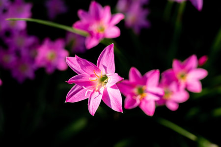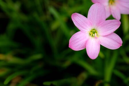 Beautiful little pink Rain flower petals on fresh green linear leaf, pretty tiny vivid corolla blossom under morning sunlight, petite groundcover plant for landscape design, know as Fairy lily