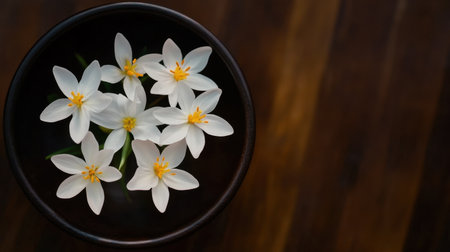 A serene image of delicate white flowers with vibrant yellow centers floating in a dark bowl. This composition evokes feelings of tranquility and beauty.