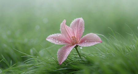 AI Generated. Delicate Pink Flower with Water Droplets on Green Grass Landscape