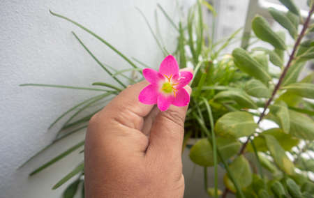 Holding a beautiful pink color Zephyr lily at indoor garden at home in Dhaka, Bangladesh