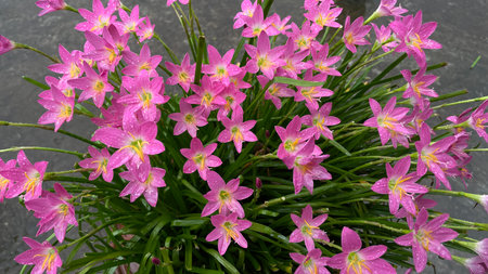 Bright pink flowers of Rain lily or Zephyranthes lily and dark green leaves with blur gray background. Another name is Fairy Lily, Atanasco Lily.