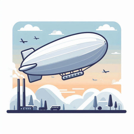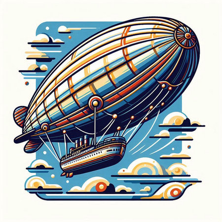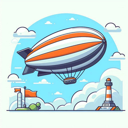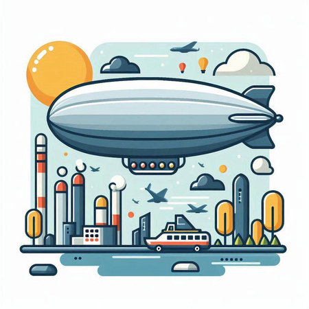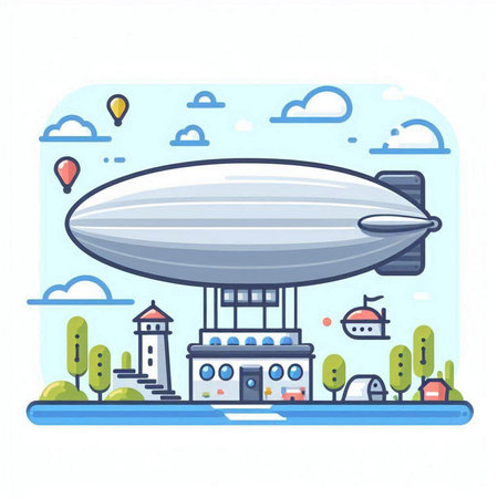 Vector illustration of an airship with a ship in the background.