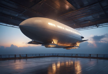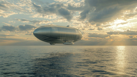 Soaring high tranquil ocean futuristic airship captures essence innovation backdrop golden sunlight and dynamic clouds.