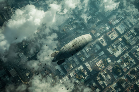 An airplane soaring above a bustling metropolis, capturing the urban landscape from above, A panoramic view of a surveillance blimp monitoring an urban area from above