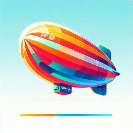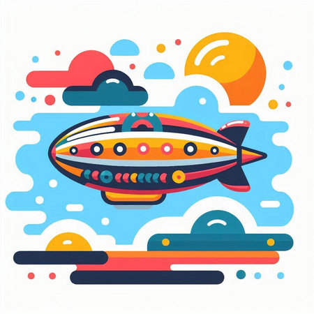 Illustration of a colorful dirigible on a blue sky background.