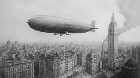 Historic cityscape with zeppelin over urban skyline.