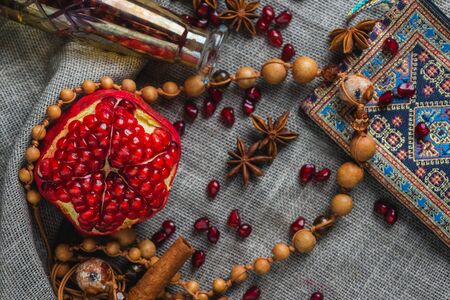 Juicy aromatic pomegranate on the table with a decor of national ornaments. Soft focus and beautiful bokeh.