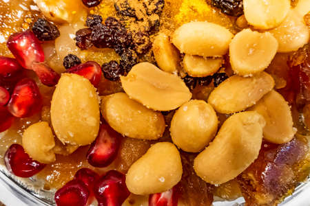Iranian jewelled rice topped with orange zest, nuts and raisins in traditional plate