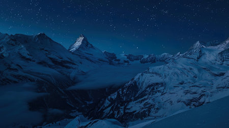 Majestic matterhorn mountain under starry night sky with low fog covering valley in swiss alps