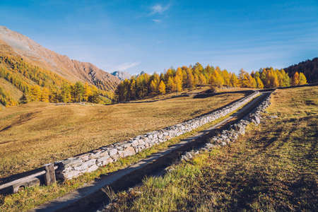 Beautiful autumn alpine landscape with colorful trees, lake and mountains