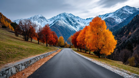 A picturesque autumn scene featuring a peaceful road flanked by brilliant orange and red trees, set against stunning snow-capped mountains under a dynamic sky.