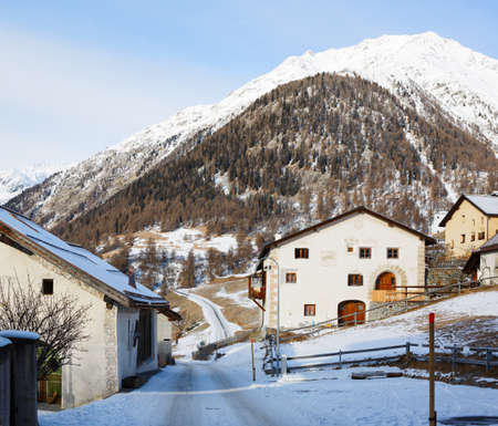 Country road with traditional houses in Guarda, Lower Engadine, Graubunden; Switzerland