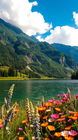 Beautiful alpine lake with blooming flowers in summer, Switzerland