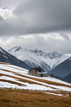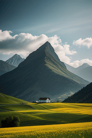 A lush meadow of blooming daisies contrasts beautifully with distant, snowy mountain peaks. AI Generative