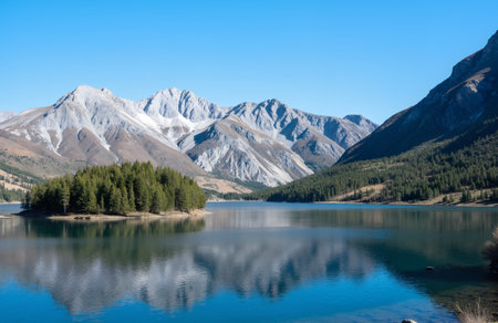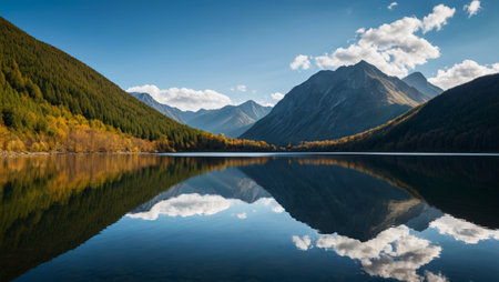 Autumn alpine landscape with lake and mountains reflection in lake.