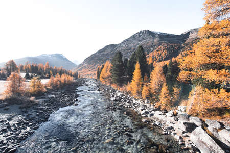 Stunning view of the peak Ela of swiss Alps with colorful trees in autumn, Canton of Grisons, Switzerland