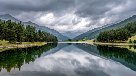 A breathtaking view of a tranquil mountain lake surrounded by dense green forests under a cloudy sky. The scene captures reflections on the water, providing a serene atmosphere.