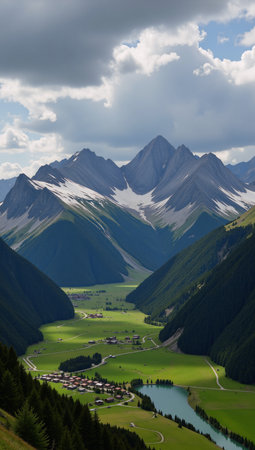 Sky showing winding mountain road through a lush green valley with a small village and dramatic cloudy sky overhead keywords: mountain road, winding, serpentine,...