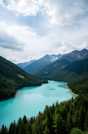 Beautiful turquoise lake in the mountains surrounded by coniferous forests