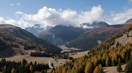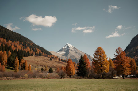Mountain autumn landscape with colorful forest and high peaks in the background