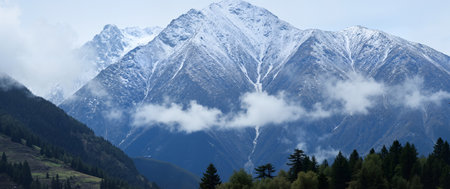A panoramic shot of snow covered mountain peak with alpine trees at the base of the mountain