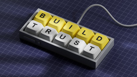 Build trust symbol. Computer keyboard keys with words Build trust.Business and Build trust concept. Copy space. Conceptual image.3D rendering on blue background.