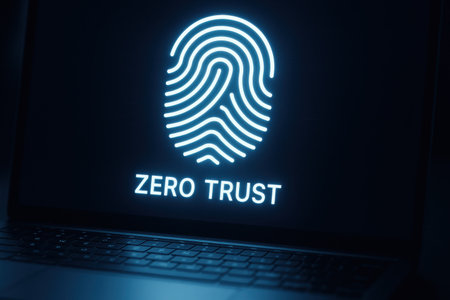 Zero trust security concept with fingerprint icon glowing on laptop screen at night