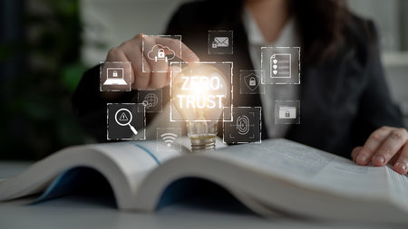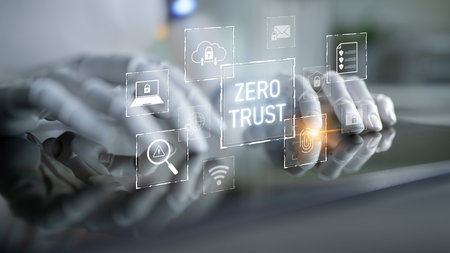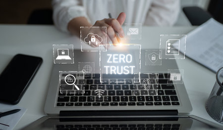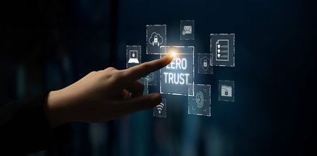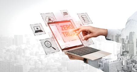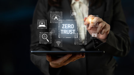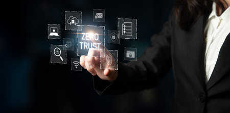zero trust security concept, Person using computer with zero trust icon on virtual screen.