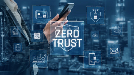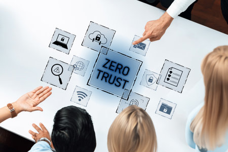 A diverse business team collaborates in a modern office, emphasizing the Zero Trust cybersecurity strategy through technology visuals and data icons.