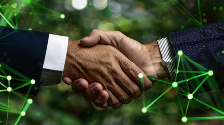 This image captures a close-up of two hands exchanging a handshake, surrounded by digital network graphics. It symbolizes partnership, collaboration, and mutual trust in a professional context.