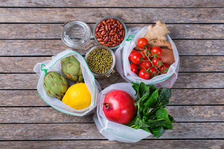Reusable mesh bags filled with various healthy fruit and vegetable. Top view.