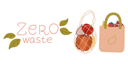Zero waste, objects isolated with a white background. Recycling of garbage, natural products, no plastic. Vector flat design. Inscription zero waste bags natural food. Health and planet conservation