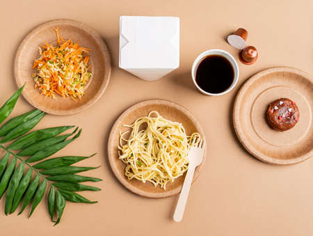 Eco friendly zero waste disposable tableware with pasta, salad and donut top view flat lay on brown background