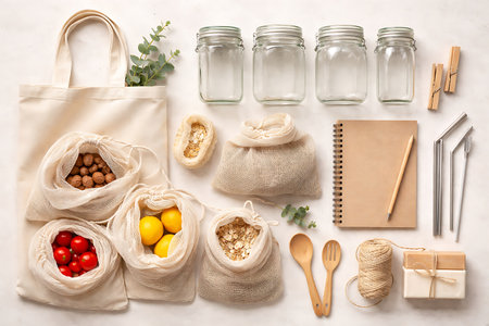 Overhead view of various zero waste and sustainable living essentials laid out on a white background. The collection includes a reusable canvas tote bag, mesh produce bags with walnuts, lemons, and cherry tomatoes, along with oats, empty glass storage jars, wooden kitchen utensils, metal straws, a kraft notebook, natural soap bars, twine, and wooden clothespins, promoting an eco-friendly and plastic-free lifestyle.
