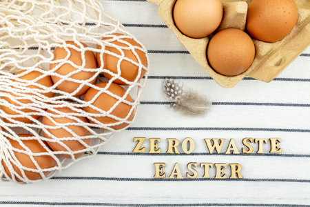Zero waste Easter concept. No plastic bag concept. Minimal style. Beige mesh shopping bag with brown chicken eggs on textile background.