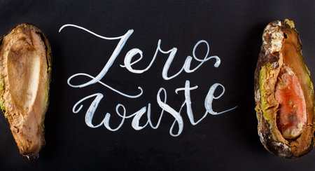 Small chalkboard with zero waste lettering and rotten avocado top view