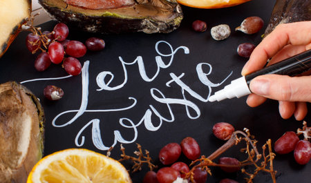 Somebody writing on a chalkboard Zero Waste lettering with rotten fruit around