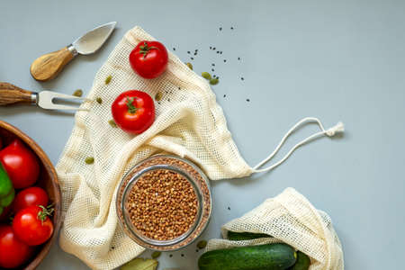 Zero waste healthy food-cereals, seeds, vegetables flat lay on grey background. Groceries in textile bags,glass jars, wooden bowl. Eco friendly plastic free low waste lifestyle.