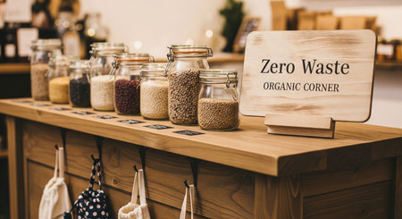 Zero waste organic corner display with variety of grains in glass jars on wooden counter. concept of sustainable shopping, eco-friendly lifestyle, environmentally conscious choices.