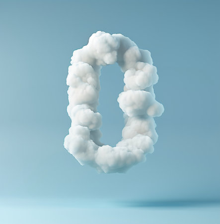 The number 0 is made of white clouds, floating in the air on a light blue background.