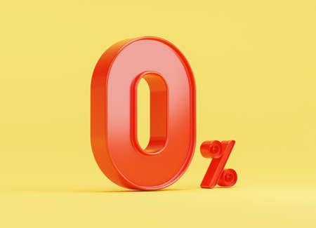 Red glossy metallic zero percentage or 0% for special offer of shopping department store discount and banking interest rate concept by realistic 3d render.