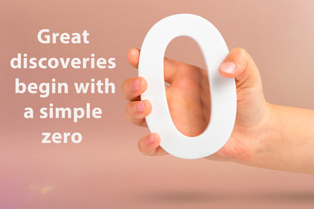 Great discoveries start from a simple zero. Close-up concept photo of a hand holding a white zero on a red background. Motivational text, inspires new discoveries and striving for success.
