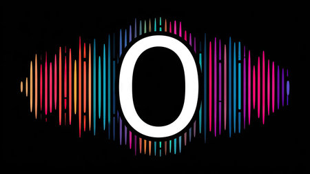This graphic showcases the letter O centrally positioned against a backdrop of vibrant, vertical lines reminiscent of a sound wave. The colorful design incorporates shades of red, orange, yellow, green, and blue on a black background. Suitable for multimedia projects, the image can be used for promotional and illustrative purposes.