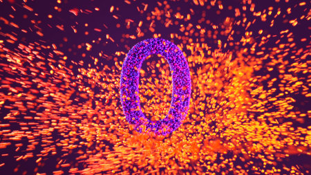 Glowing number 0 surrounded by exploding fiery particles on dark background