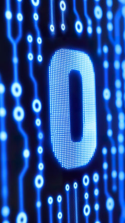 Bright blue digital display of the number zero with circuit patterns on a dark background.