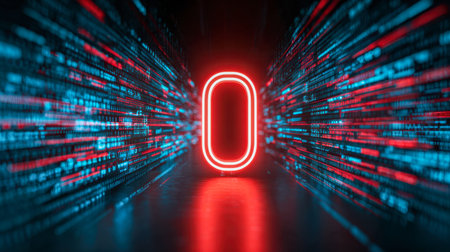 A sleek, high-tech virtual hallway illuminated by vibrant neon hues, featuring a prominent red zero emblem amid cascading streams of blue and red digital symbols, evoking