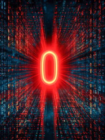 A luminous crimson '0' shines centrally amid a dynamic expanse of streaming data, pulsating in a high-tech corridor filled with vibrant streams and digital pulses.