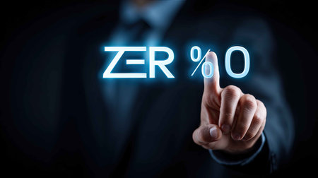 A close-up image of a professional person interacting with a digital display showing zero percent. This representation signifies achievement in business metrics and innovation.