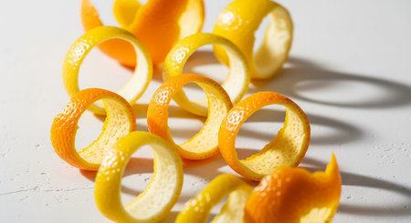 Curled strips of orange and lemon peels are scattered across a bright white surface.