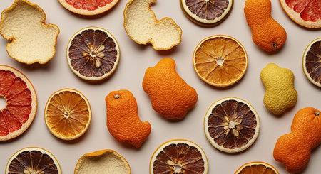 A flat lay arrangement of various dried citrus slices, whole fruits, and peels on a neutral surface.